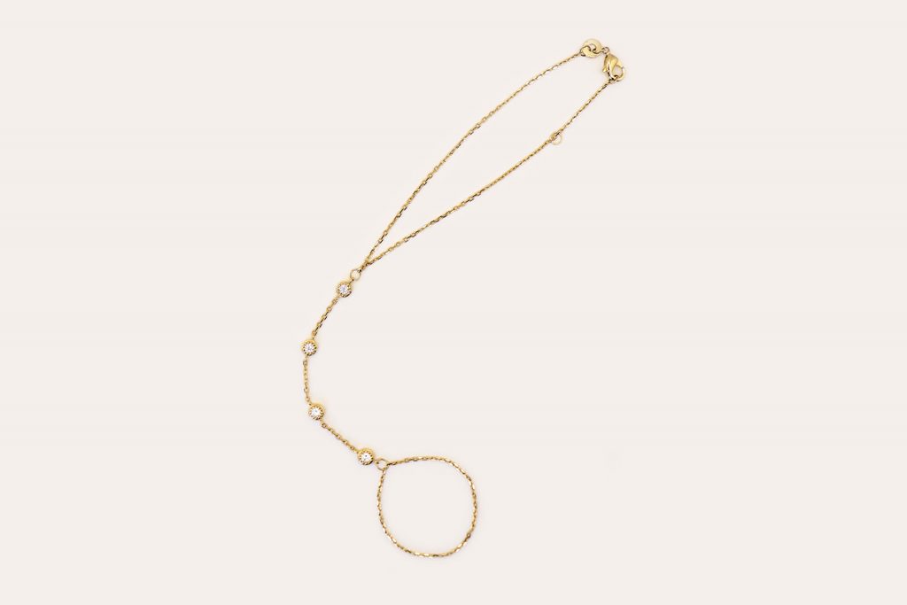 Thin chain wraps around wrist and finger, joined by 4 cubic zirconia sparkling on the back of the hand