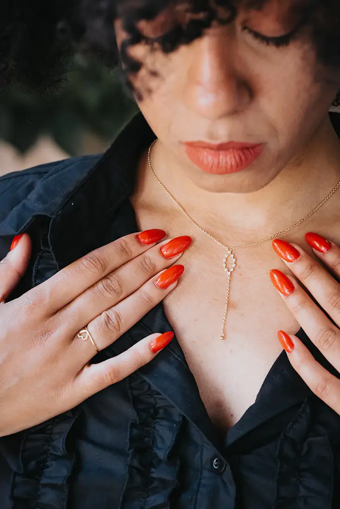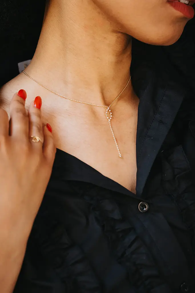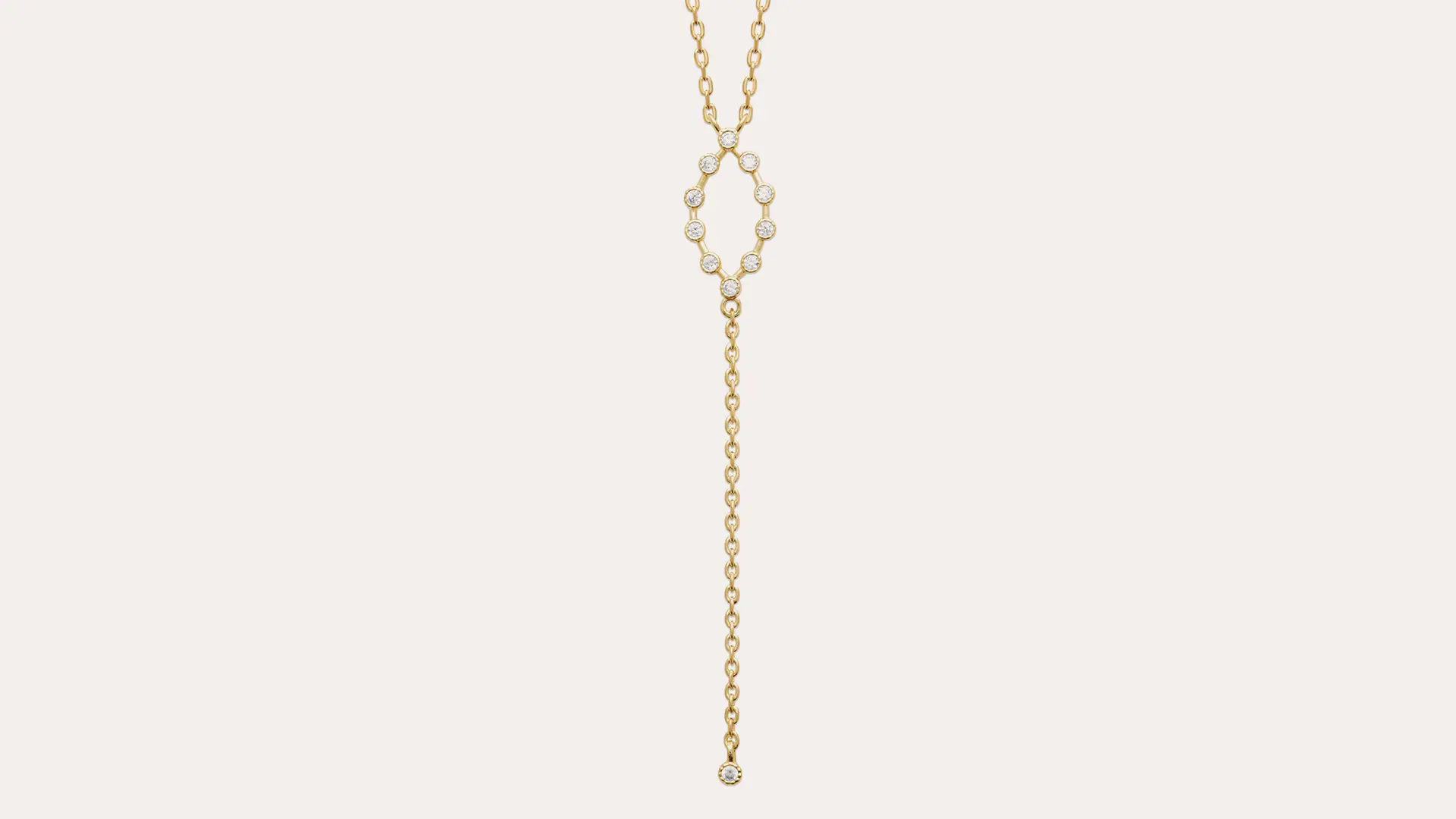 Necklace with a 12mm hollow drop fixed pendant, with round micro cubic zirconia in its circumference and a 5cm pendant chain in its underside;a 2mm cubic zirconia at the end of the chain acts as a very classy detail in this necklace with original and innovative design