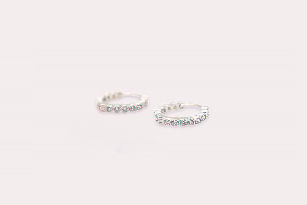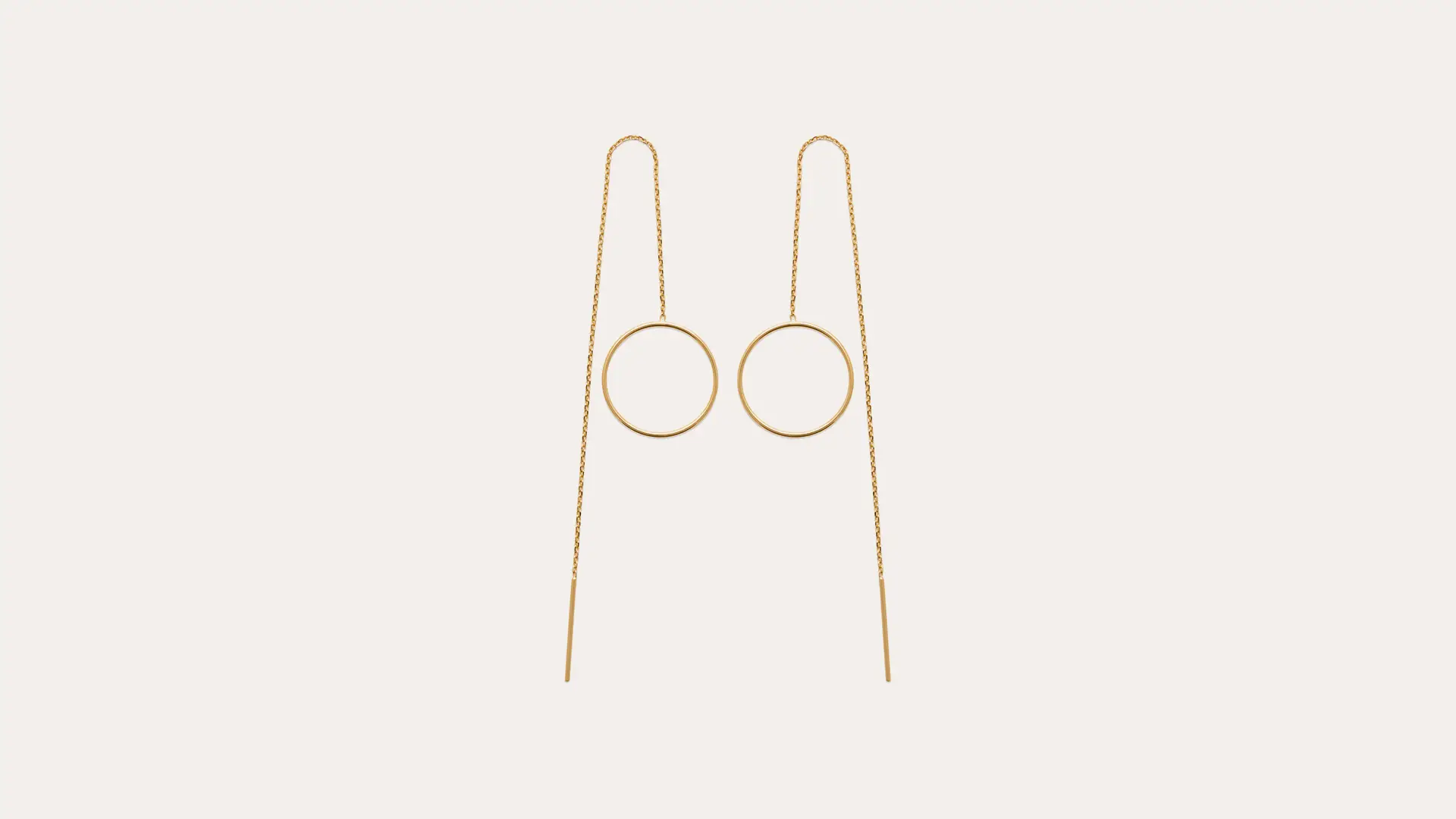 Earrings with a thin (1mm) 2cm diameter hollow hoop and a 12.5cm long chain with a stiff end so that it can be threaded through the second and third lobe holes! Eye-catching and innovative for a fashionable and sophisticated look