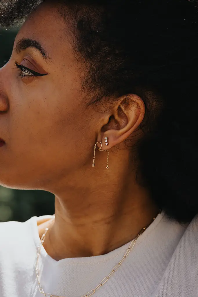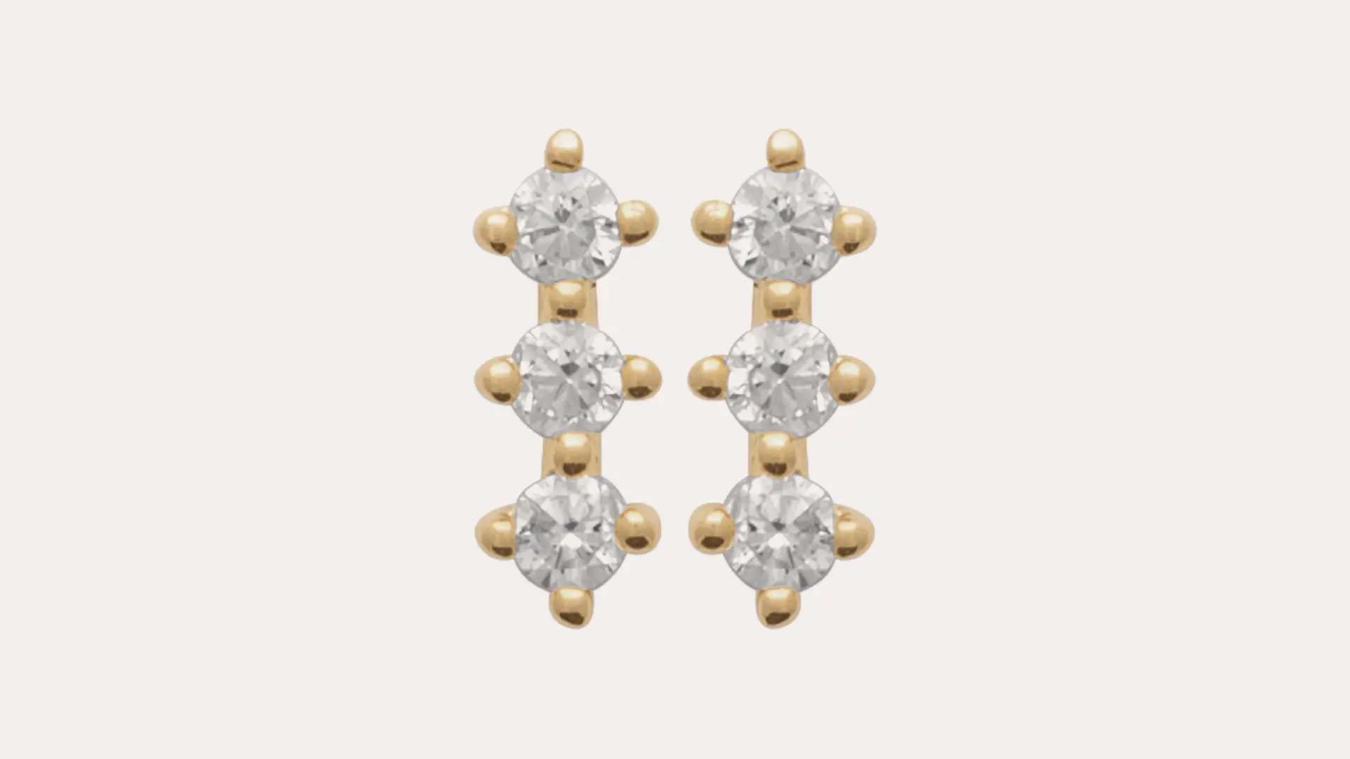 Lobe earrings consisting of 3 cubic zirconia in a row (2mm each) supported by a 4-jaw setting finished with polished dots that characterize the design, with a total length of 9mm; original and gritty may have a bit of a rock flavor but fit beautifully with an elegant outfit