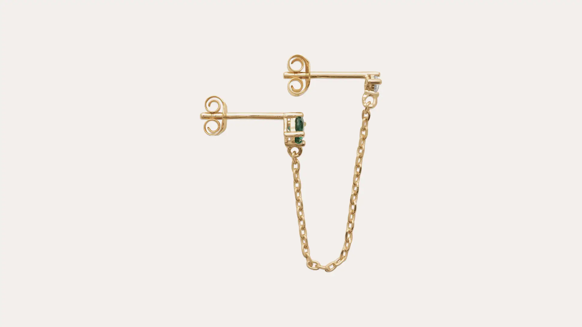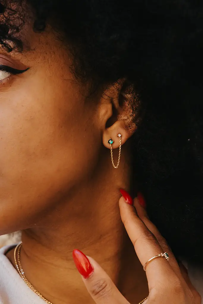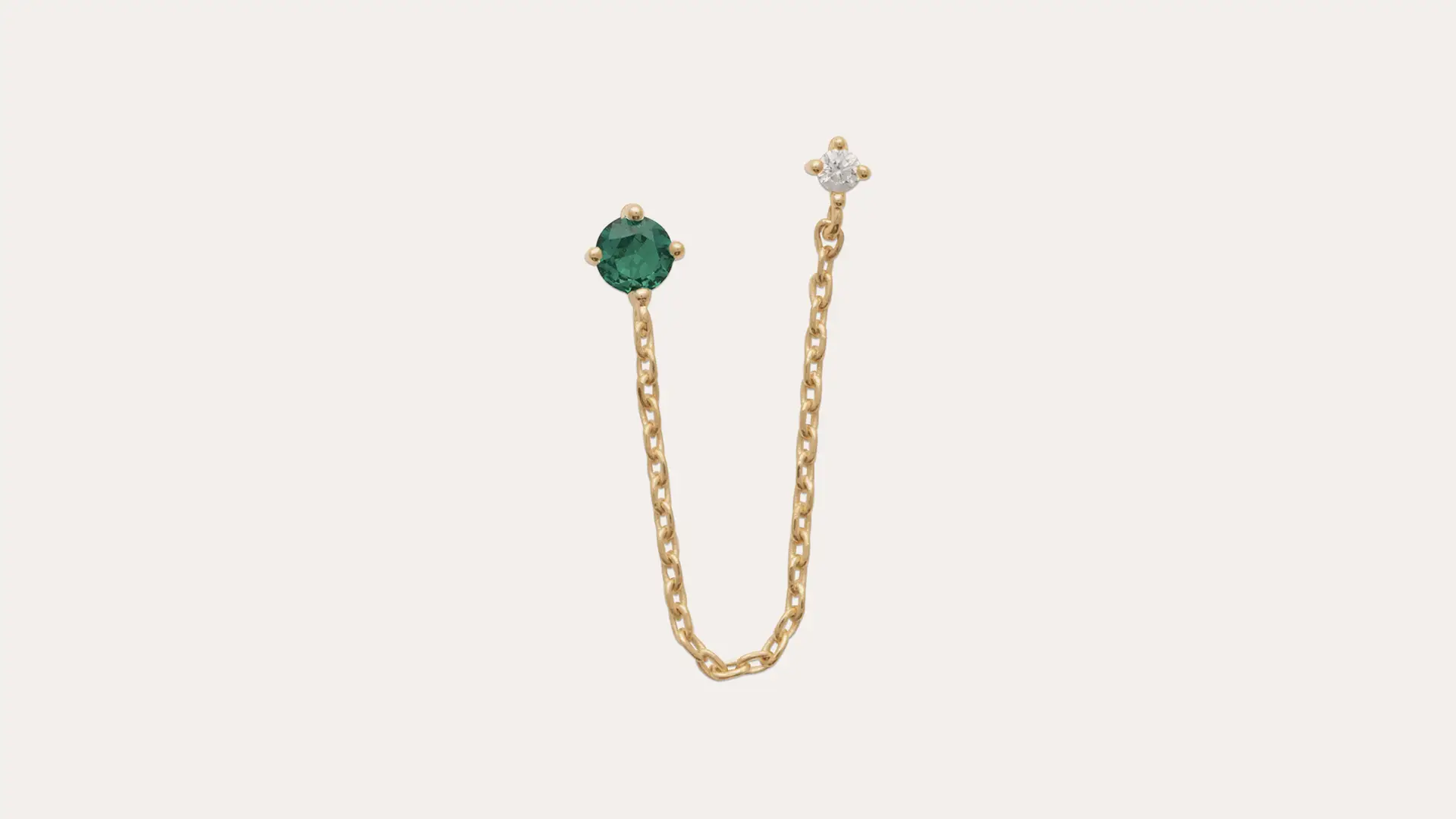 A unique single earring designed for double lobe piercings, featuring an intense green zircon (3 mm) on one side and a white zircon (2 mm) on the other. Both stones are set with four delicate bead-finished prongs that enhance light reflection. The two studs are connected by a fine 4.5 cm chain.