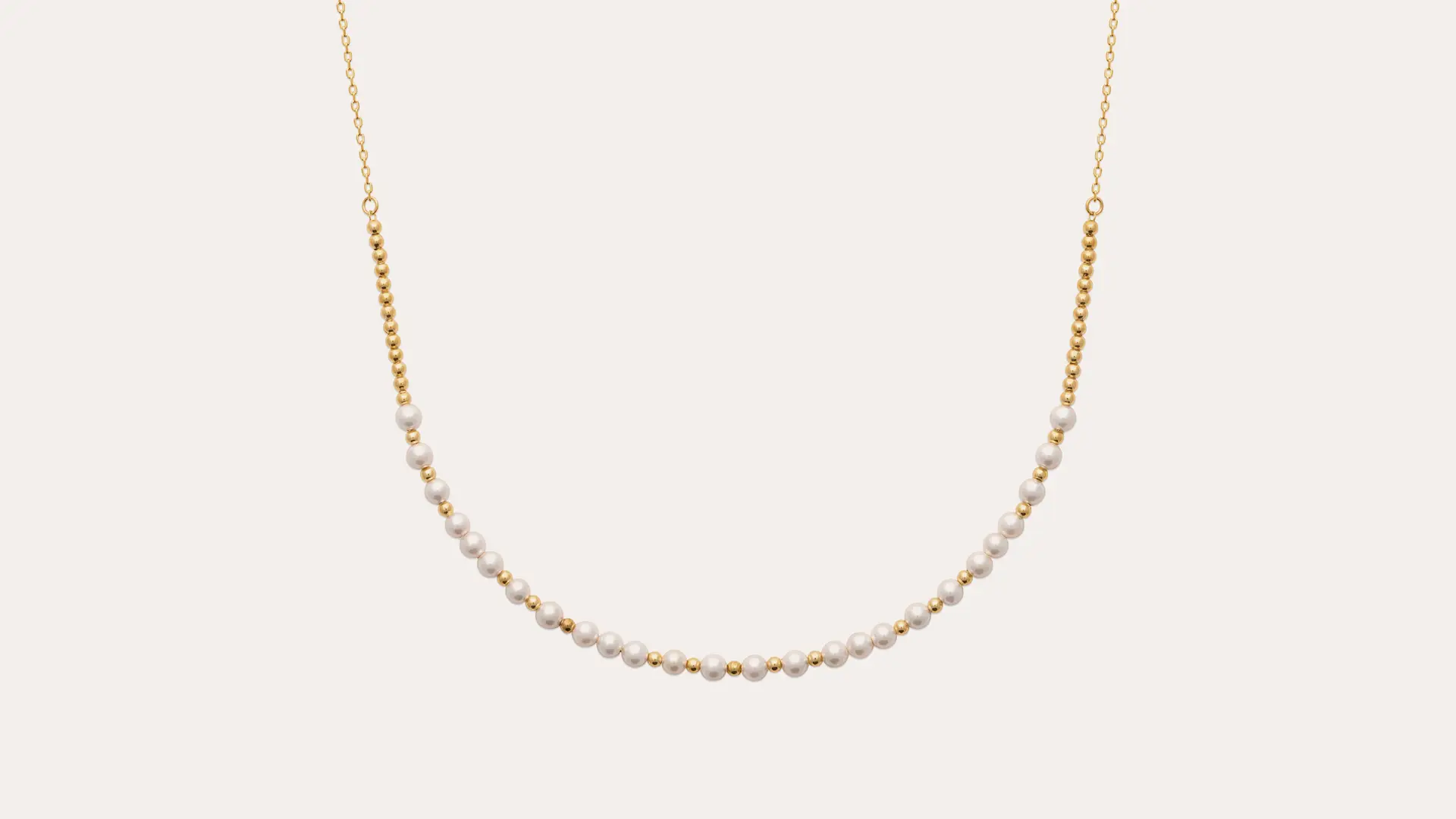 Collana di perle sintetiche alternate a pallini dorati nella parte davanti; alle 2 estremità una fila di 13 pallini dorati completa il mezzo giro della collana