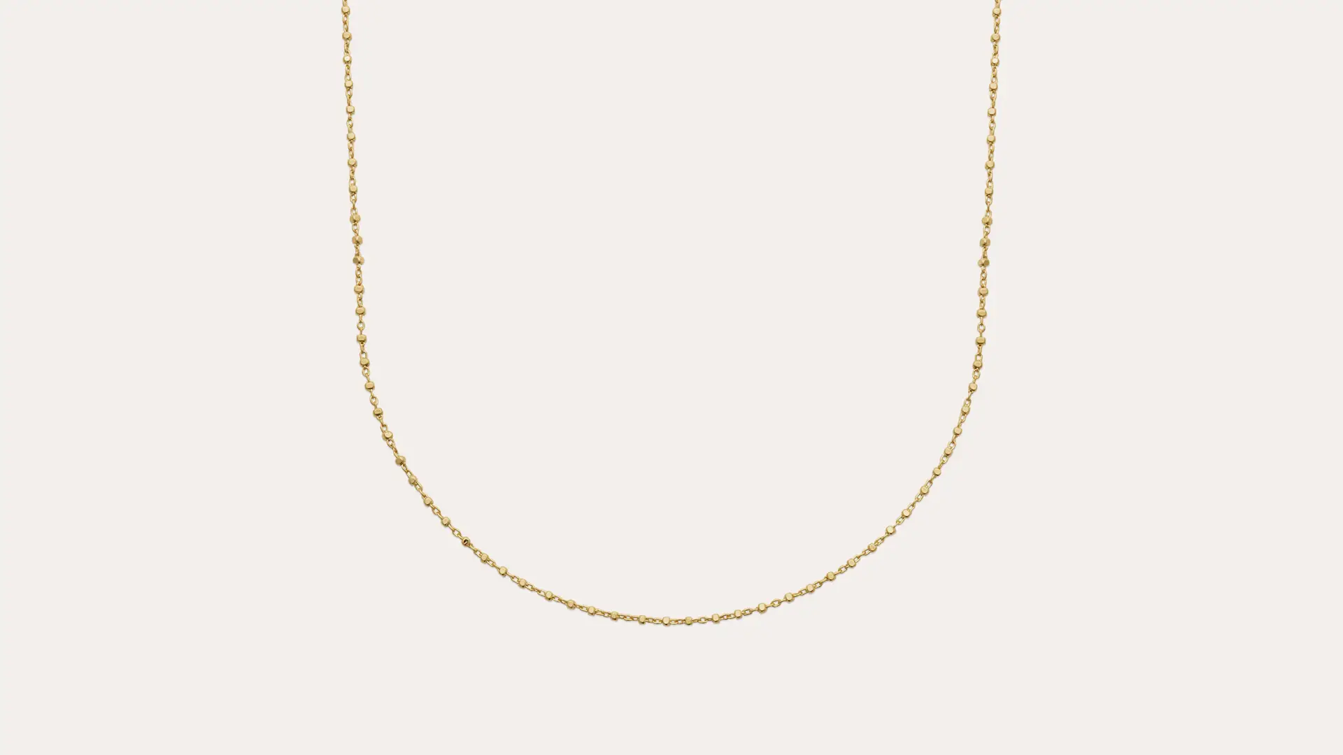 Collana con maglia a micro cubetti di 1mm lato, distribuiti in tutta la lunghezza della collana ogni mezzo centimetro di catena; molto luminosa indossata da sola o in abbinamento con altre collane per uno stile fashion