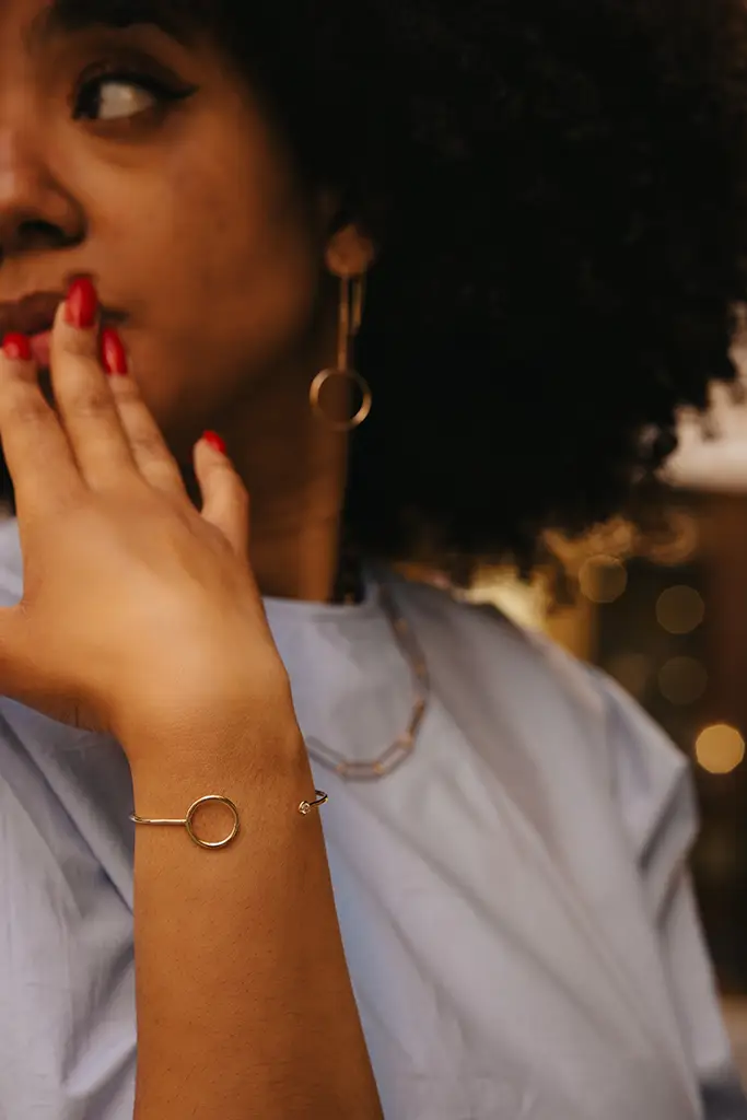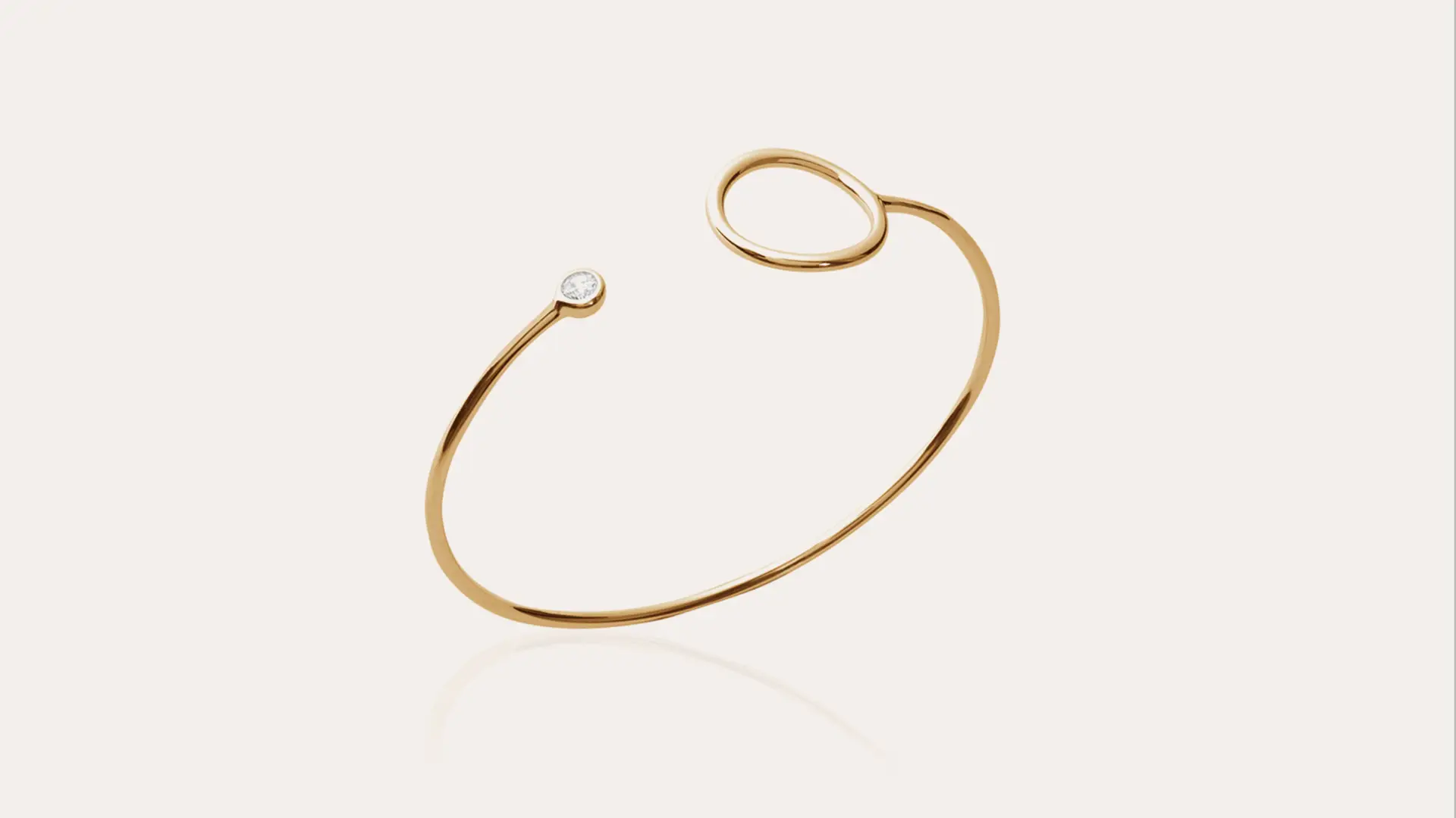 Bracciale rigido aperto(JONC) con motivo a cerchio vuoto ad una estremità (diametro 2cm) e uno zircone di 4mm all’altra estremitÃ