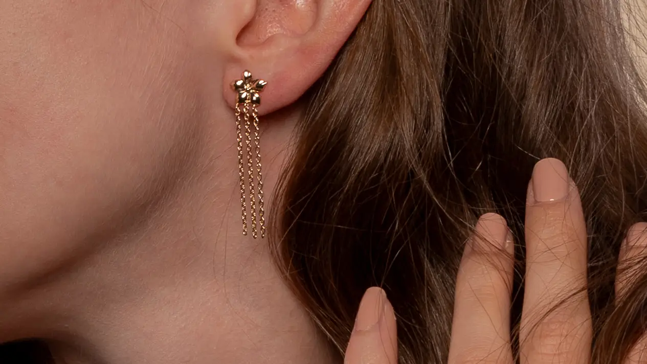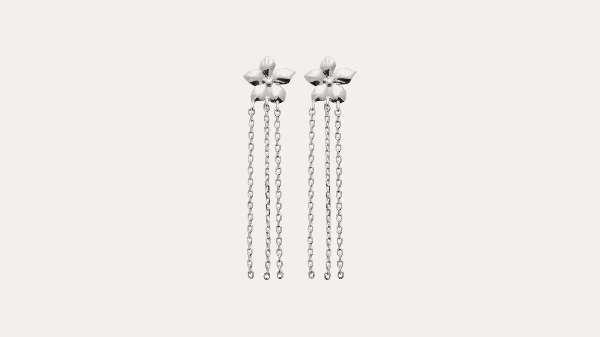 Orecchini con fiore a lobo diametro 1cm, con 5 petali in rilievo e 3 catene sottili pendenti di 3,2cm; i petali sono leggermente bombati per dare un effetto di movimento e valorizzarne la lucentezza