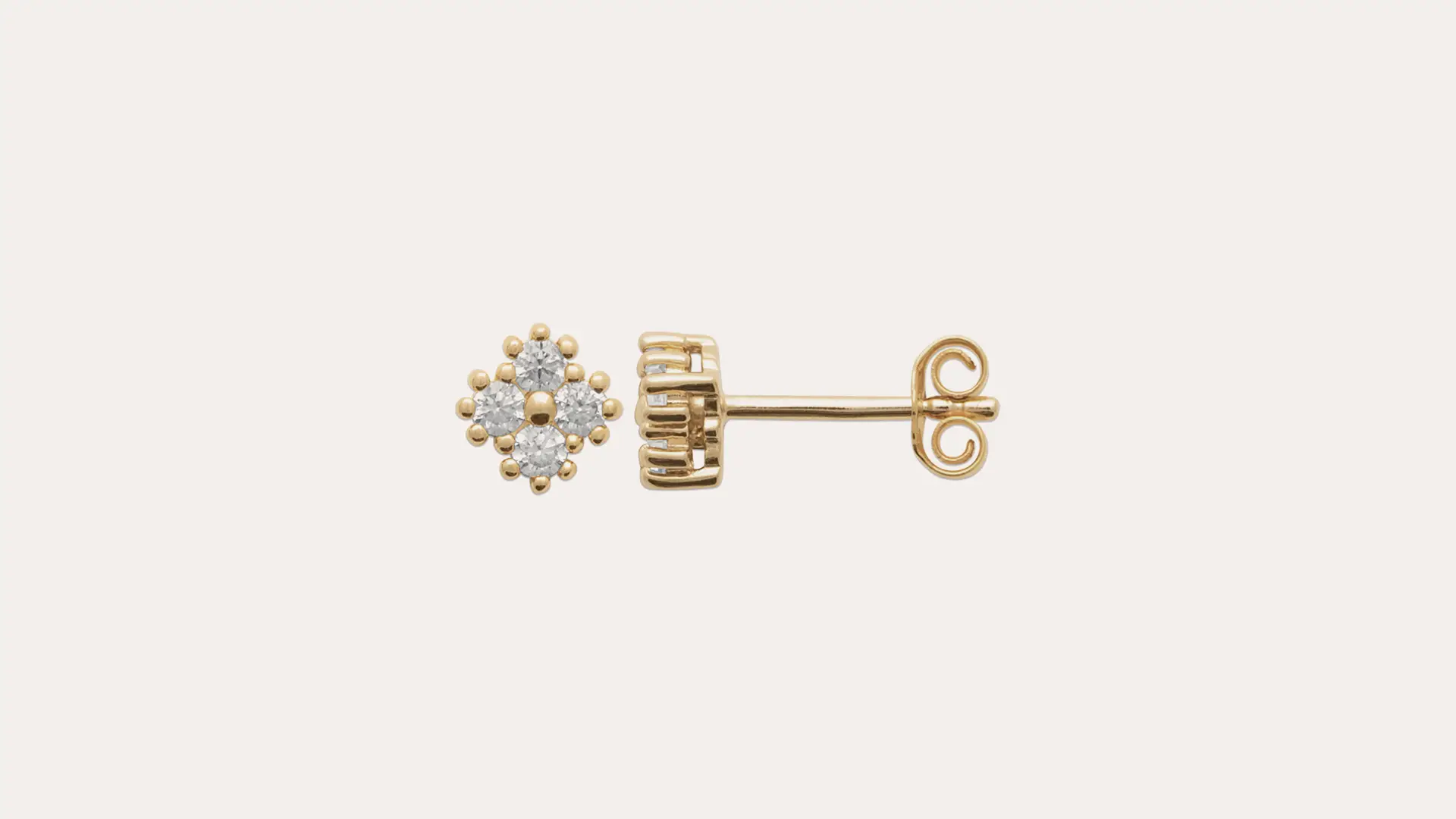 Orecchini a lobo costituiti da 4 petali a zircone contornati da pallini in metallo lucidi in rilievo e al centro un pallino più grande in metallo lucido,misura 6mm