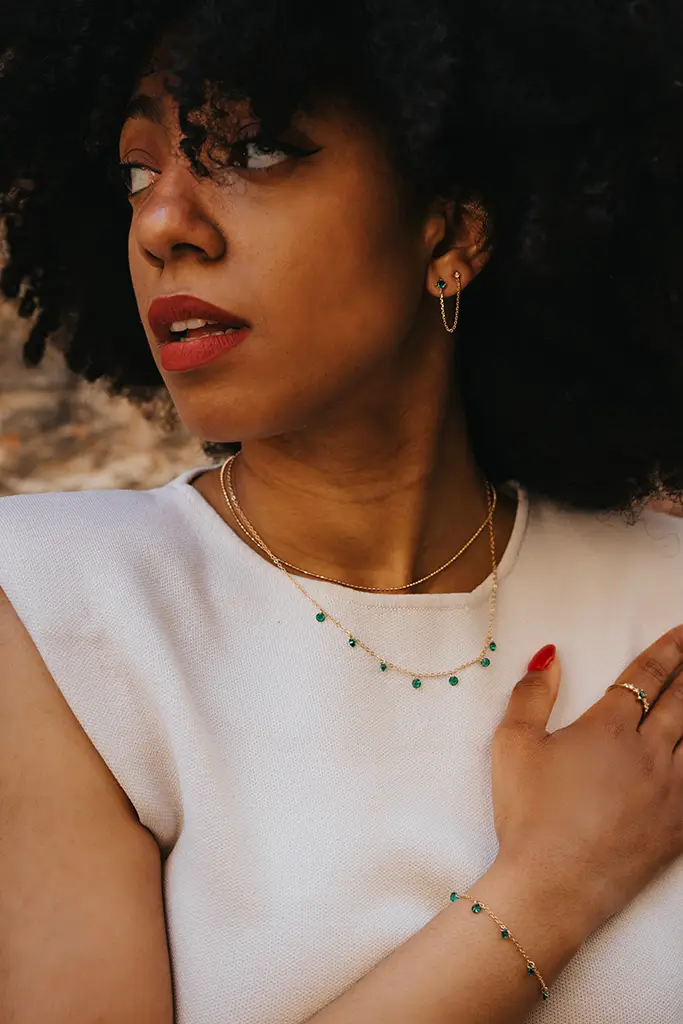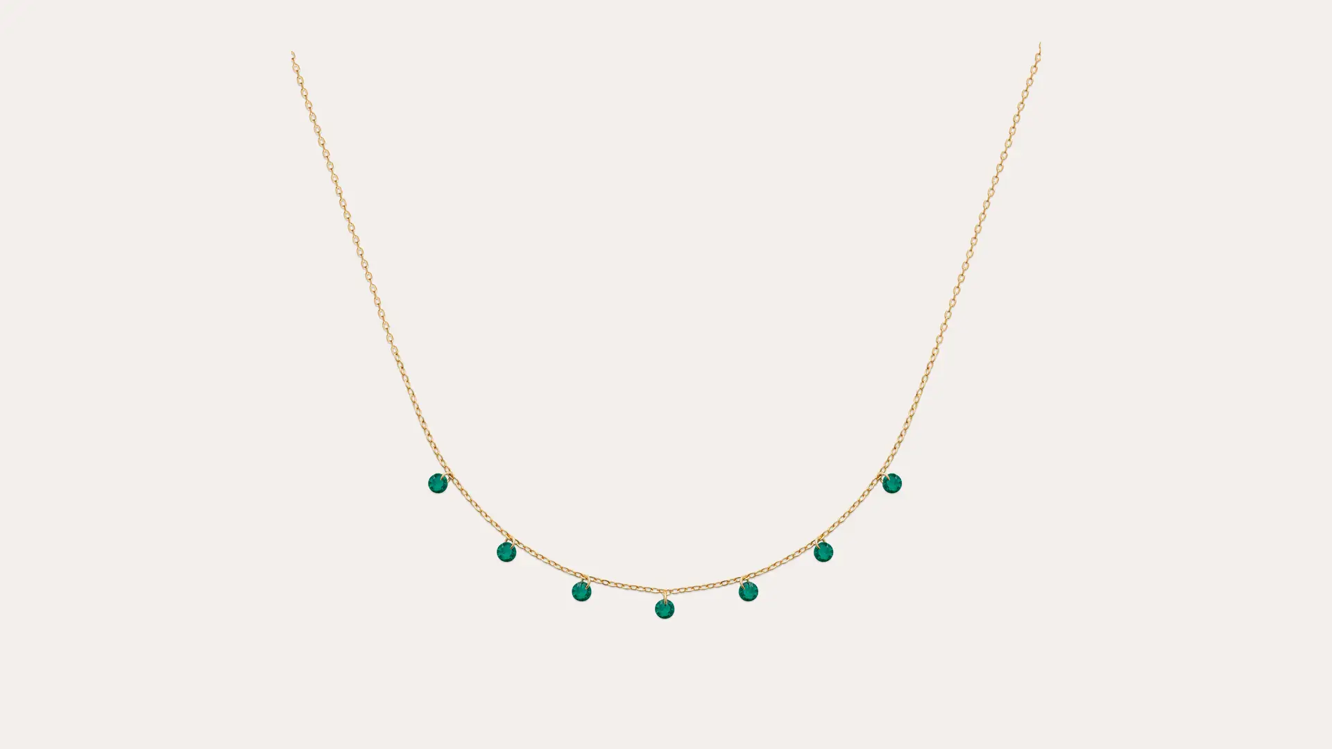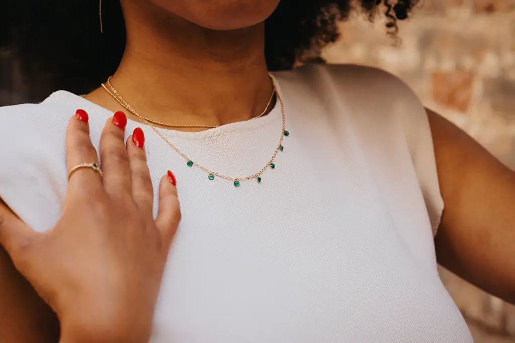 Collana con zirconi pendenti a taglio vivo, senza cornice per riflettere la loro luminosità da ogni lato, valorizzando il loro colore e brillantezza sulla pelle;