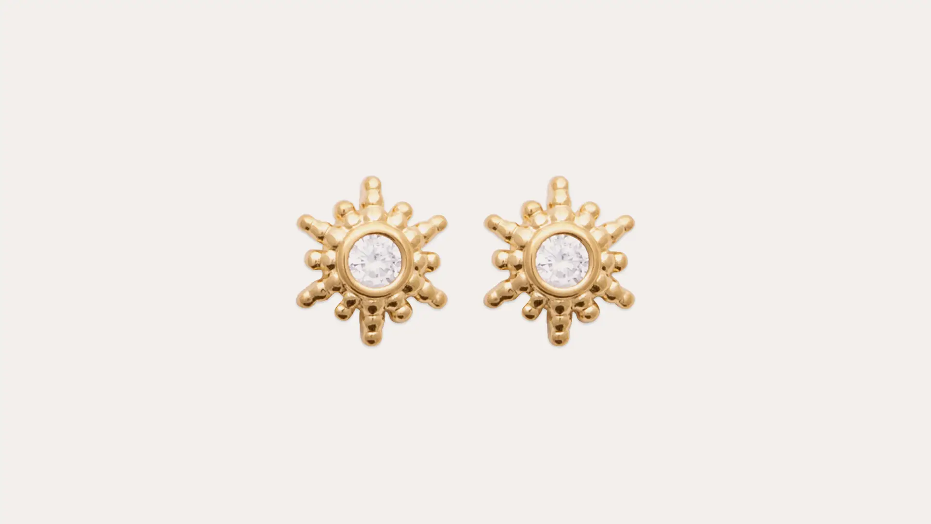 Orecchini a lobo a forma di sole con i raggi a pallini bombati e uno zircone rotondo al centro; adatti da primo buco ma molto d’effetto anche nei secondi e terzi buchi per uno stile ricercato;misura 5mm