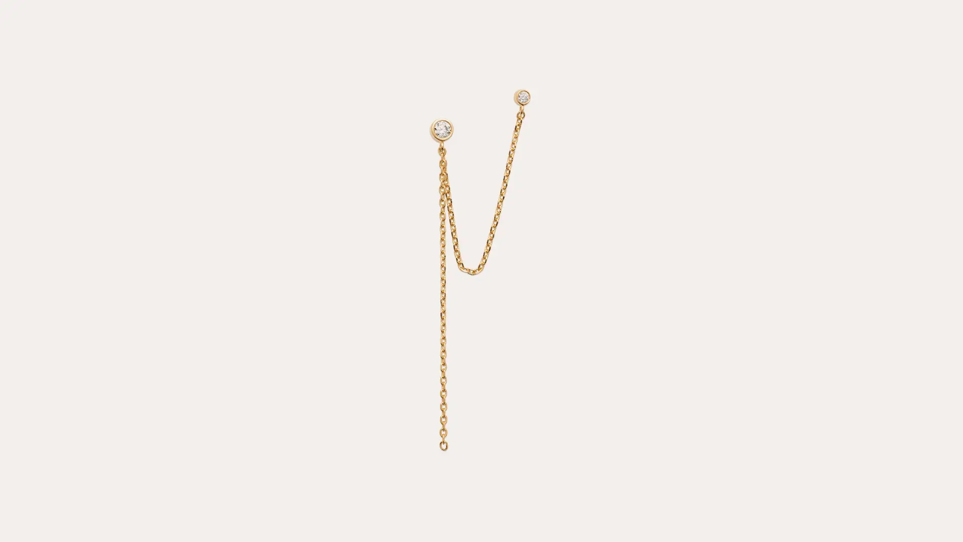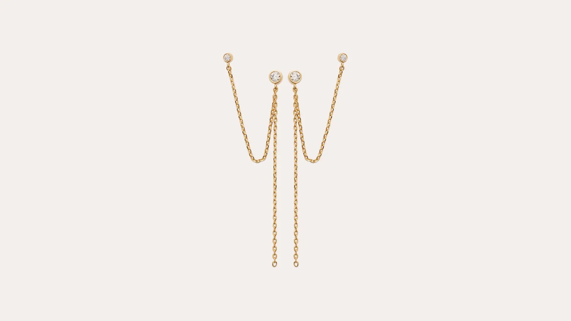 Orecchini per 2 buchi nel lobo costituiti da uno zircone di 3mm e uno zircone più grande, 4mm a cui è attaccata una sottile catena pendente lunga 4 cm