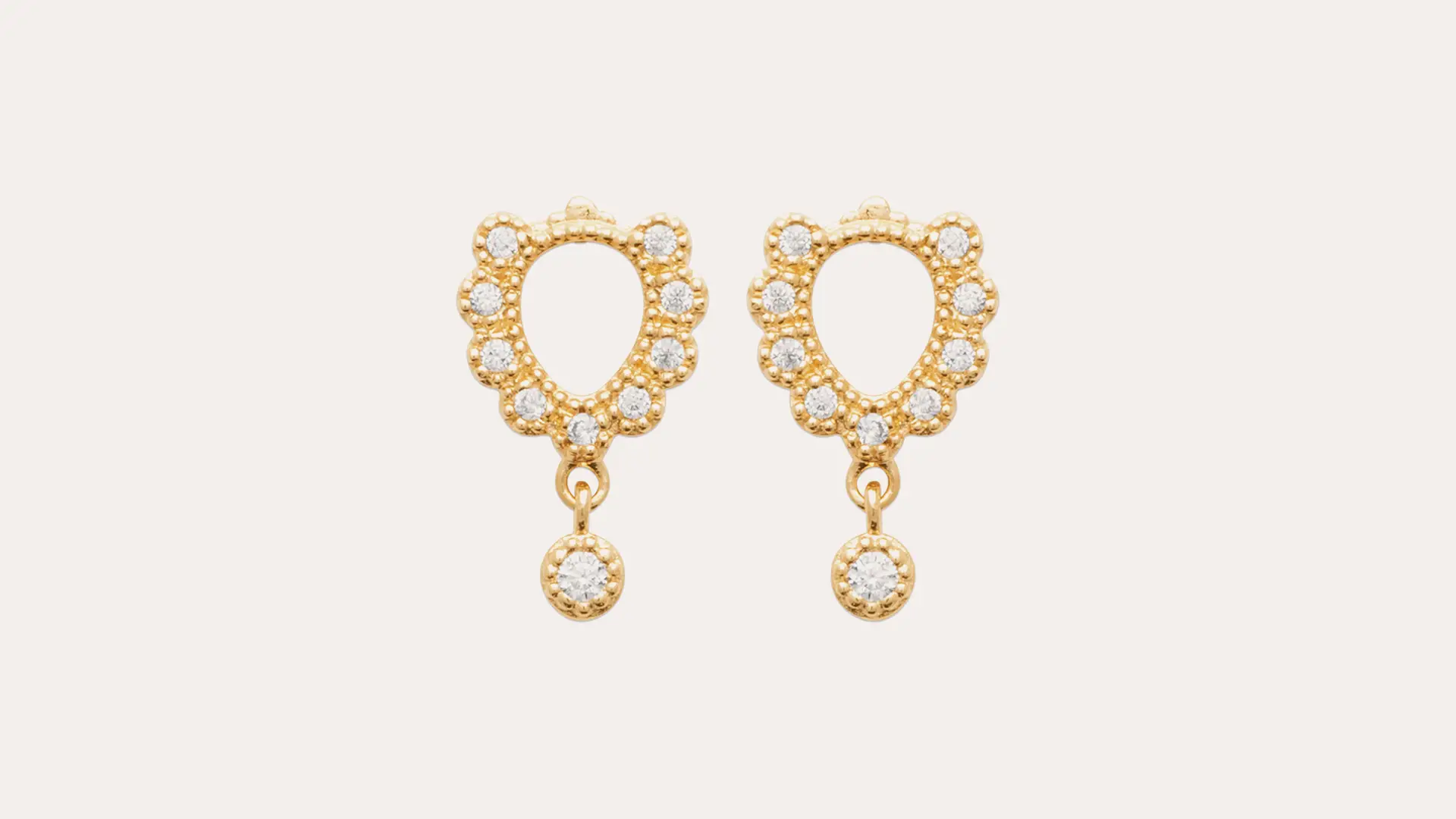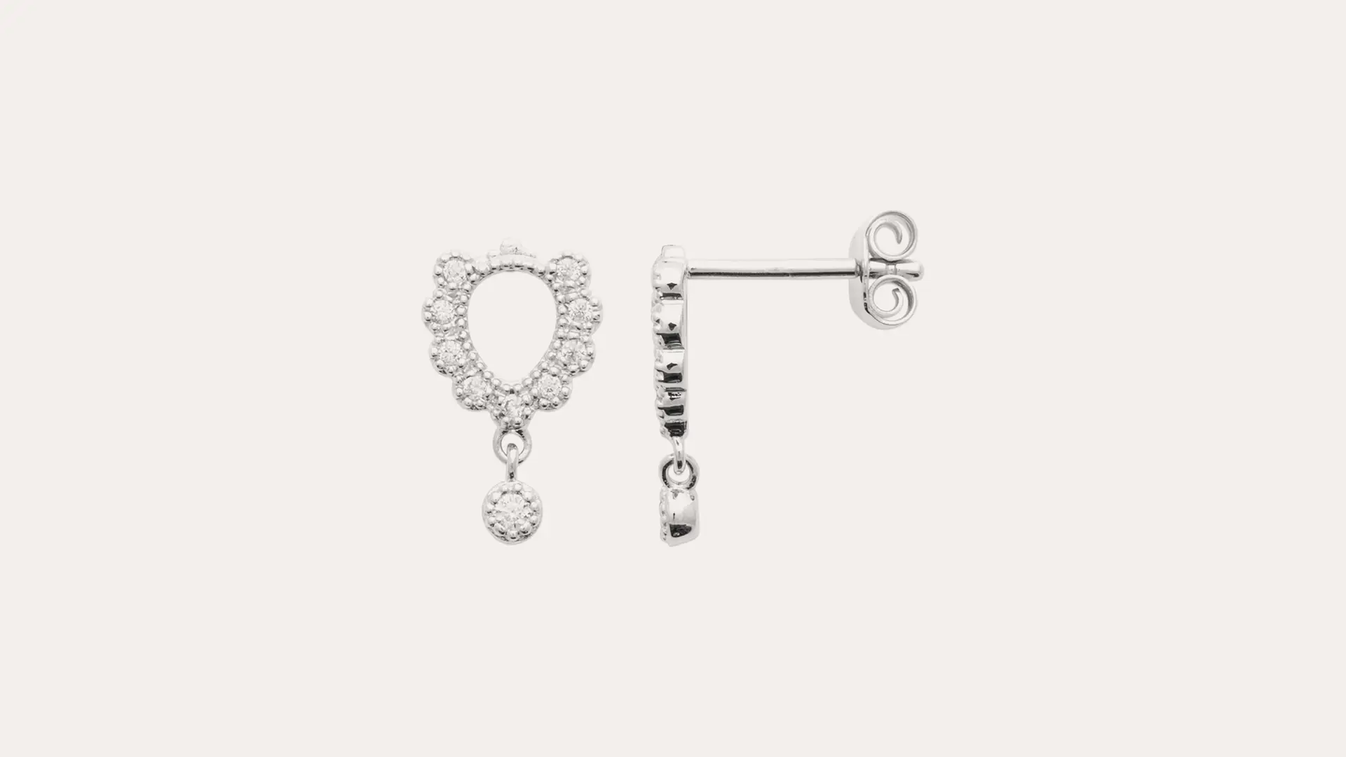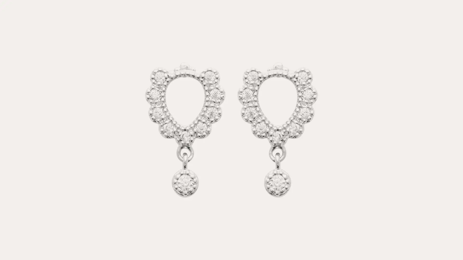 Orecchini a ferro di cavallo con zirconi incastonati in tutta la loro superficie e il contorno mantiene l’onda degli zirconi che debordano leggermente; la parte superiore è chiusa da un motivo curvato e a pallini e un piccolo zircone pendente e mobile è agganciato alla base;l’incastonatura con micro pallini in rilievo ne esalta la luminosità e dona a questi orecchini un sapore un po’ retro’