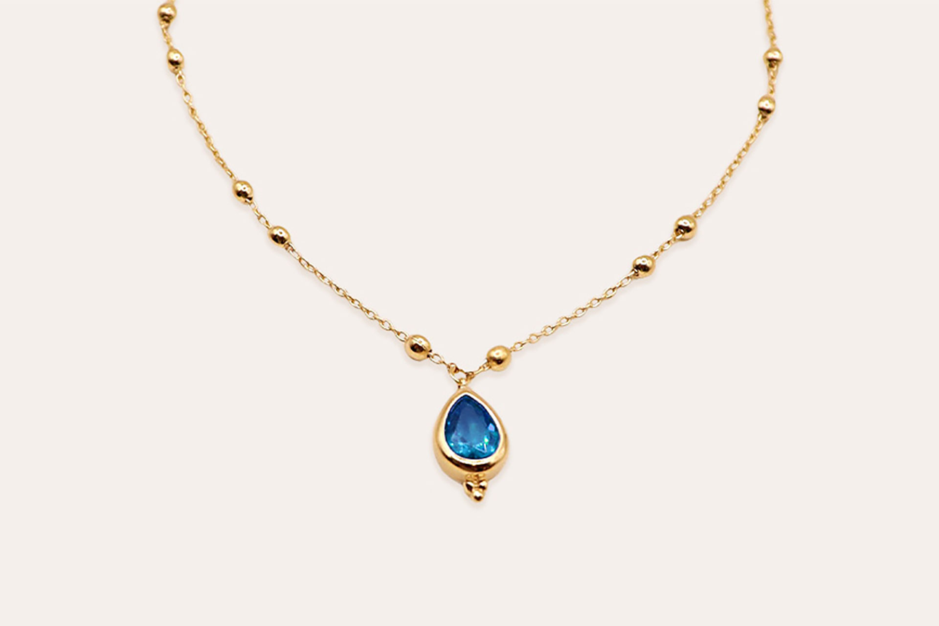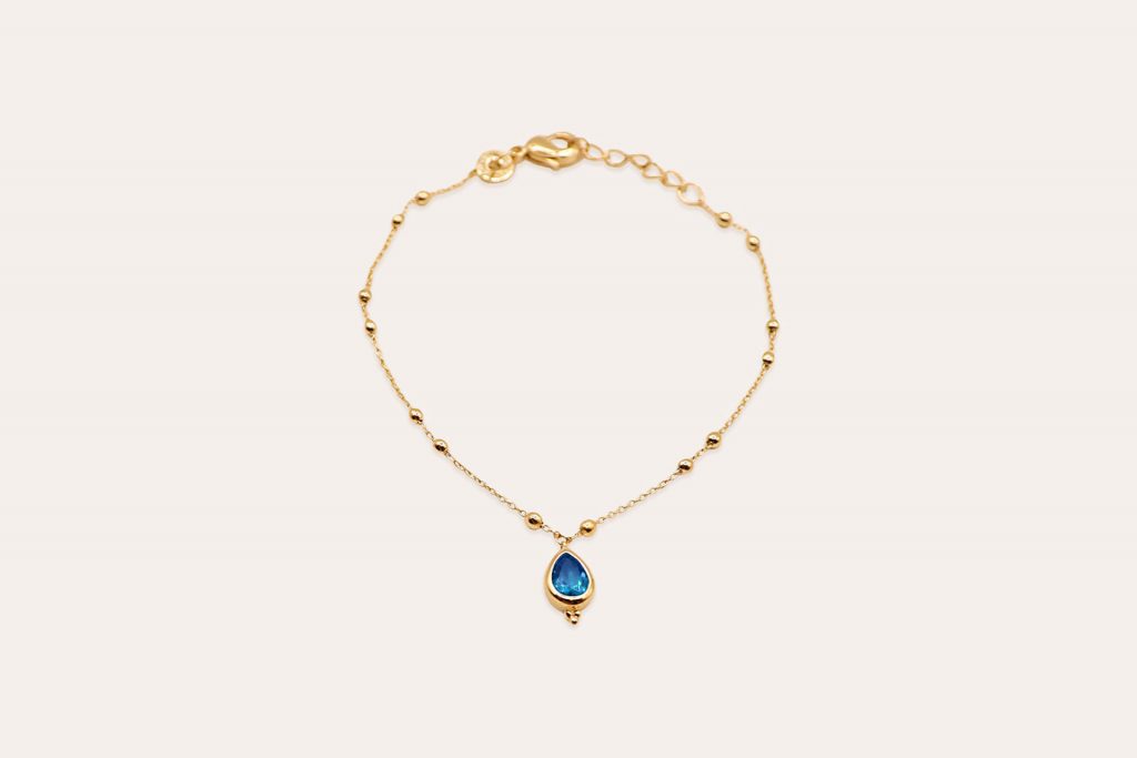 Bracciale con pallini lucidi inseriti nella sottile catena e uno zircone pendente a forma di goccia con tre micro pallini posizionati a triangolo nella parte bassa del pendente;